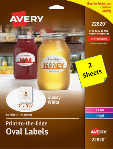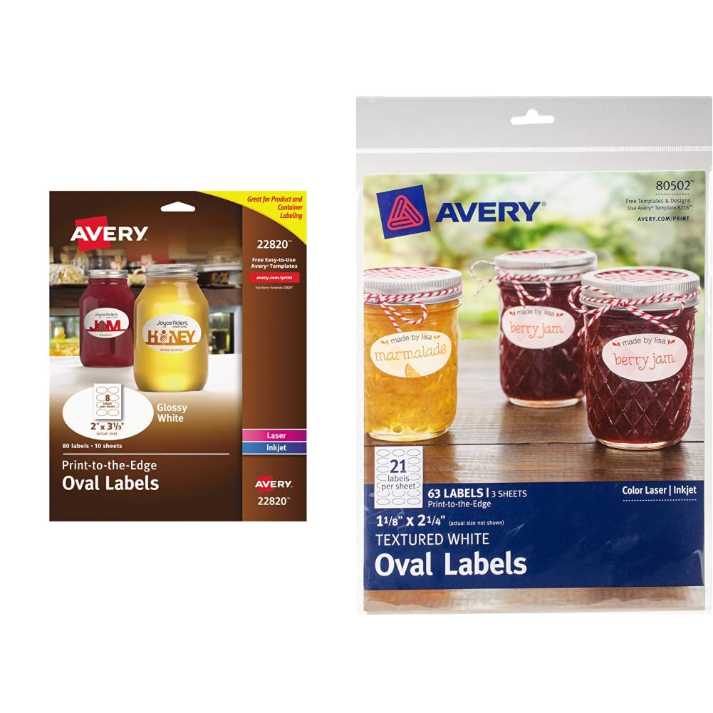 Avery® 22820 Easy Peel 2" x 3 1/3" True Print White Glossy Oval Print ... Avery 22820 Specs Quantity 80 / Pack Shipping Weight 0.37 lb. Length 3 1/3 Inches Width 2 Inches Adhesive Type Permanent Color White Features Easy Peel Printer Compatibility Inkjet Laser Shape Rectangle Style Printable Type Multi-Purpose Labels Product Packaging Labels Avery 22820 Details